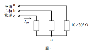 【已刪除】一、三個阻抗值均為10∠30° Ω的阻抗,以 Y 結線方式連接至一平衡三相電源,如圖一 所示。若電源電壓中之V