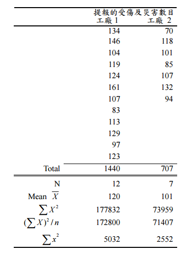【已刪除】五、有兩家工廠,工廠 1 及工廠 2,它們所提報的受傷及災害數目如下表,請問這兩家 工廠的工安事故率是否有所差別?(一些需要計算的數目列於表的下方)(20 分)