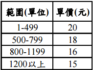 【已刪除】五、某電子公司每年穩定消耗 6000 單位之電子開關,此電子開關之訂購成本為 100 元 /次,訂購前置時間為固定,每單位電子開關每年之持有成本為單價之 10%,購買 之單價享有全部數量折扣(all unit discount),訂購數量範圍與相對應之單價列於 下表,最佳訂購數量應為多少?(20 分)