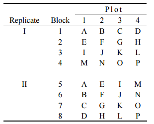 ⑶下列是一個不完全區集設計之配置圖,一共有兩個重複(replicate),每一重複 含有四個區集(block),每個區集含有四個試區(plot),請觀察其配置方式, 並說明是何種不完全區集設計?(6 分)