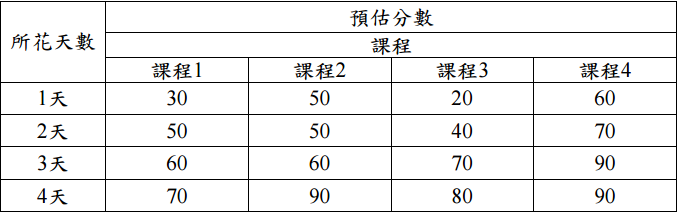 【已刪除】五、你正在準備參加技師考試,假設你只剩七天但是有四個科目要準備。你不想放棄任 何一科,所以每一科至少要花一整天,而且你也決定一天只念一科(所以說每科最 多能夠花四天來念)。以下是你估計出來每科花時間去念以後所會得到的效益。請 用動態規劃(Dynamic Programming)的方法來決定你要如何來分配期末考前這七 天的時間,以使得四科的總分最多。(20 分)
