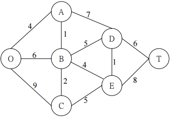 【已刪除】二、請在以下的網路上,求出從 O 點到 T 點的最短路徑(Shortest Path)以及該路徑的 長度。(請列出詳細的求解過程。節線上的數字代表該節線的長度。)(10 分)