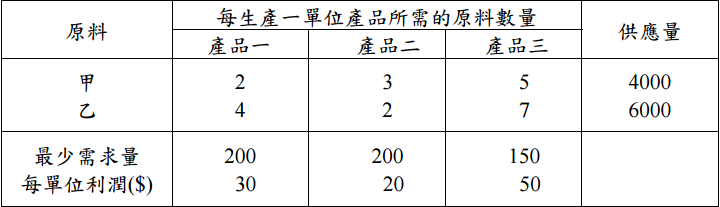 【已刪除】一、某公司打算利用兩項原料來生產三種產品,下表提供所需要的各項資訊。 生產每單位產品一所需要的人力為生產每單位產品二的兩倍,生產每單位產品一所 需要的人力為生產每單位產品三的三倍。若將所有的可用人力均投入產品一的生產, 則可製造 1500 個產品一。請針對此問題,構建一個線性規劃模式來加以描述,使 得利潤為最大。(15 分)