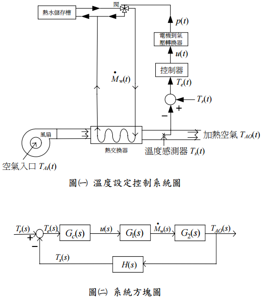 【已刪除】五、如圖一)(所示為一個氣流系統的溫度設定控制,儲水槽供應熱水(水溫Tw (t))流入熱交 換器加熱空氣,溫度感測器感測空氣溫度(T