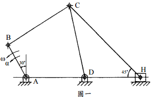 【已刪除】一、一平面連桿機構,如圖一所示,AB = 50,BC = CD = 100,AD = 80,長度單位為 mm; 若曲柄 AB 之角速度為 ω = 40 rad/sec(反時針方向)旋轉,等角加速度為 α = 700 rad/sec