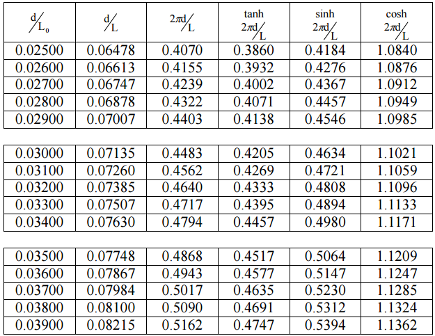 【已刪除】四、於水深 10 公尺處測得波高 3 公尺,週期 10 秒之波浪,Wiegel 表格部分資料如下表, 試推算該波浪之深海波波長、波速。並計算當水深 5 公尺時該波浪之波長、波速又 為何?(10 分)