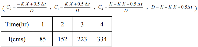 【已刪除】五、已知某河川之入流量歷線如下表所示,假設其初始出流量為 85 cms,X=0.2,K=2 hrs, 試以馬斯金更法(Muskingum Method)計算出各時刻的出流量。。