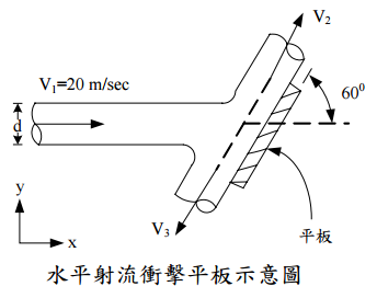=20m/sec, d=40mm,當水平射流衝擊一夾角 60 0 之平板,分成兩半流出,試求水柱衝擊此平板 的作用力。(20 分)