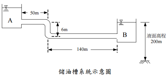 【已刪除】二、如下圖所示,假設油由上方儲油槽 A 流往下方儲油槽 B,流經一圓管其半徑為 20cm, 流量大小為 0.09 m 3 /sec,油的運動粘滯係數(kinematic viscosity)ν = 3.7 × 10