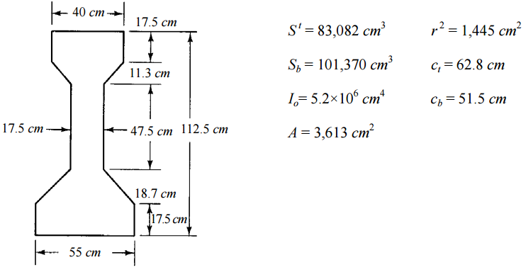 ,假設預力損失 20%,鋼線中心離底部最小距離為 20 公分,除了梁及版自重外,還有其他靜載重為 750 kgf/m,混凝土單位重為 2,400 kgf/m