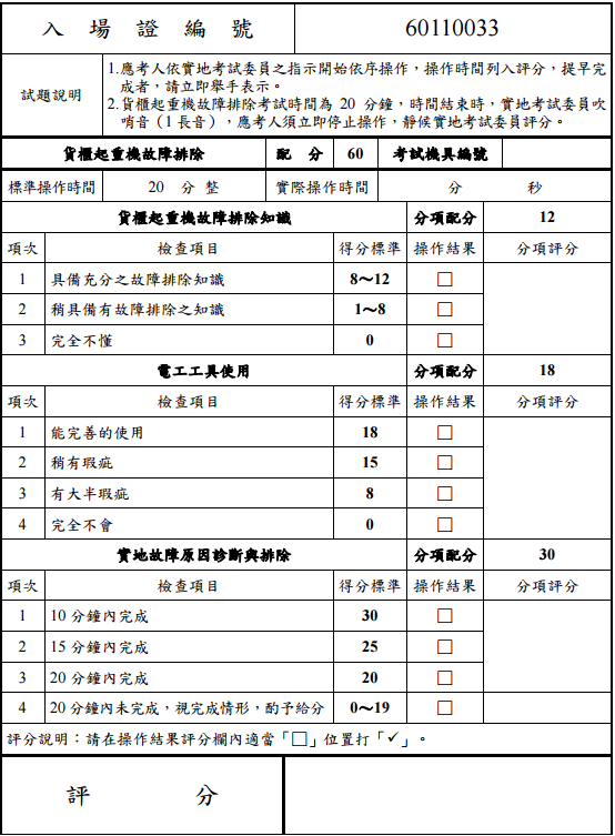 電工組實地考試「貨櫃起重機故障排除」評分表