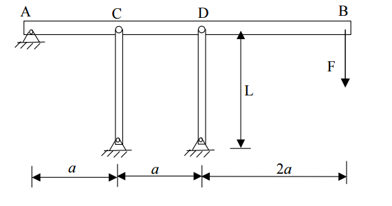 【已刪除】四、如圖所示之構件系統,其 A 點為絞接(hinge)支承,C 點及 D 點係由兩根相同的 絞接端細長柱所支持,且每根柱之撓曲剛度為 EI,試問 B 點之載重 F 為何值時將 使此構件系統崩壞?(20 分)