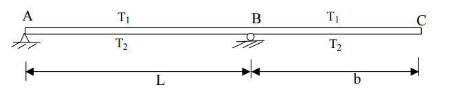 ,梁底部之溫度為 T2 ,若梁斷面高為 h,α 為其熱膨脹係數,則該梁在此溫度變化下,C 點處之垂直撓度為何?(20 分)