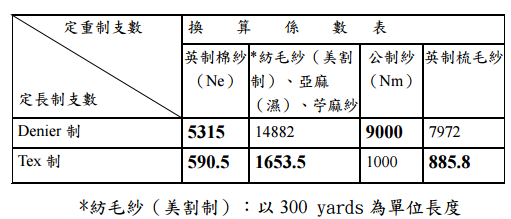 【已刪除】 ⑴定重制支數與定長制支數換算係數表中,支數的轉換值 5315、9000、590.5、