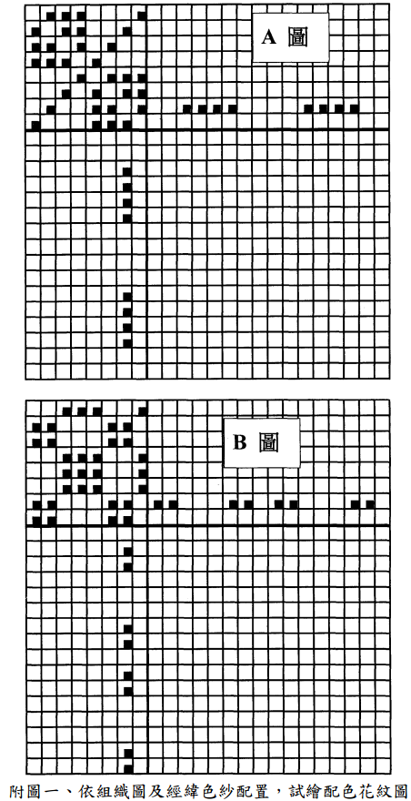 【已刪除】三、依組織圖及經緯色紗配置,試繪 A 與 B 圖之配色花紋圖(見附圖一)。(20 分)