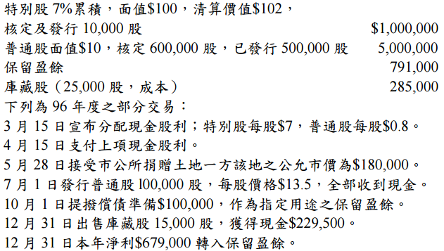 【已刪除】三、丁公司 95 年 12 月 31 日資產負債表中股東權益之內容如下:
