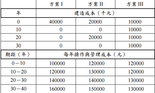 【已刪除】一、下表所示為某地區開發供水系統之四種可能方案。假設年利率為 6%,試求何種方案 具有最低成本現值(Present value)。(20 分)
