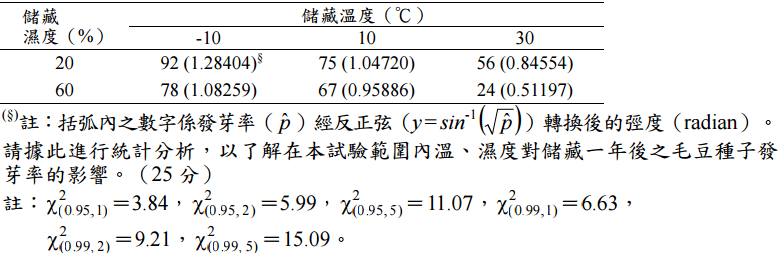 【已刪除】二、某學者擬探討儲藏條件對毛豆種子發芽率之影響。他自一批精選過的高雄 8 號毛豆 種子中隨機取出 6 個各含 400 粒種子的樣品,分置於 6 種不同的儲藏環境中。一年 後檢測各樣品之發芽百分率(%),結果如下: