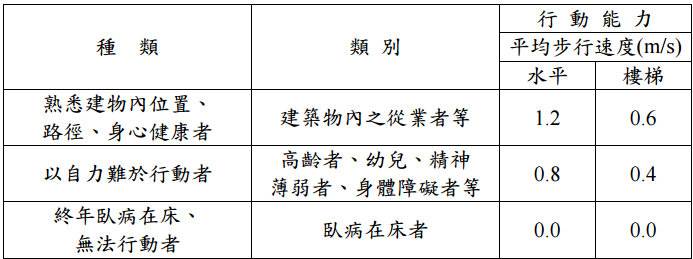 【已刪除】二、台灣地區目前正逐漸步入高齡化社會,下表係顯示不同高齡者類型行動能力。試以 Marchant 避難逃生理論就一般「以自力難於行動」與「終年臥病在床無法行動」之 高齡者行動能力,說明各階段時間與一般者之差異性?(15 分)並說明「各類場所 消防安全設備設置標準」第 157 條有關老人福利機構避難器具設置規定為何? (10 分)