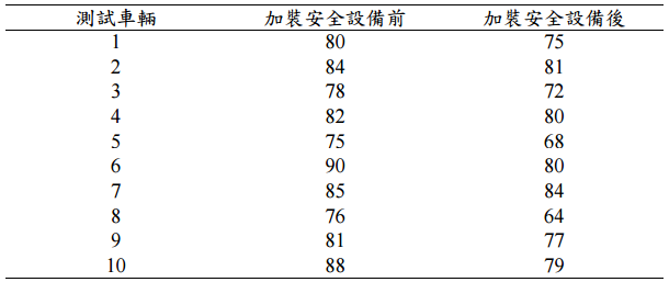 三、某車廠為比較車輛加裝安全設備前後之煞車能力,分別測試 10 輛車,並記錄其在時