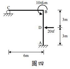 【已刪除】四、有一構架如圖四所示,桿件之 EI 均為常數,試以彎矩分配法求桿端彎矩並繪彎矩 圖。(25 分)