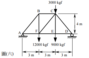 28. 如圖(六)所示之桁架,則下列敘述何者錯誤?( C 代表壓力,T 代表張力 ) (A) AB 桿件的內力為 15000 kgf ( C ) (B) BC 桿件的內力為 9000 kgf ( C ) (C) AF 桿件的內力為 9000 kgf ( T ) (D) EF 桿件的內力為 9000 kgf ( C )