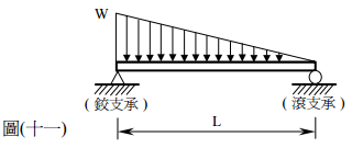 36. 由荷重、剪力與彎曲力矩之關係可知,當一簡支梁承受一均變荷重時,如圖(十一)所示, 其彎矩圖應為何種型式? (A) 水平直線 (B) 傾斜直線 (C) 二次拋物線 (D) 三次拋物線