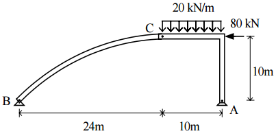 【已刪除】四、如圖所示,L 形 AC 桿件與弧形 BC 桿件以釘栓接合,支承 A 和支承 B 都為鉸支承。 試求支承 A 和 B 之反力,並計算 BC 桿件之受力。(20 分)
