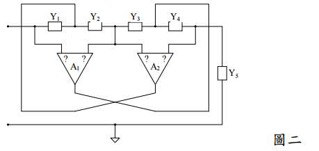 二、如果圖二中的兩個運算放大器(Operational Amplifier)在主動線性區操作,請推導該 電路以決定其輸入端的正負極性。(25 分)