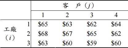 【已刪除】一、某公司在 3 個工廠生產 1 種產品,銷售給 4 位客戶。工廠 1、工廠 2 與工廠 3 在下 期各可生產 3,000 件、5,000 件與 5,000 件產品。該公司已承諾銷售 4,000 件給客戶 1,3,000 件給客戶 2,至少 3,000 件給客戶 3。客戶 3 與客戶 4 表示願意購買所有剩 餘的產品。從工廠 i 運送 1 件產品到客戶 j 的單位成本如下表。試建立此問題成為 運輸問題模式,找出從各工廠應運送給各客戶的件數,以造成公司的總運輸成本為 最小。(20 分)