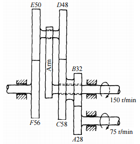 【已刪除】三、下圖齒輪系中,輸入分別為臂(Arm)轉速 150 r/min 及齒輪 A 轉速 75 r/min,齒數 A=28,B=32,C=58,D=48,E=50,F=56。試求出輸出齒輪 F 的轉速是多少? (15 分)