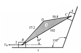 【已刪除】二、下圖 BC=102 mm,若 B 點的速度是 10 mm/s 向左,試以向量迴路法求出 C 點的速 度及桿 3(BCD)的角速度是多少?(15 分)