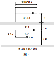 【已刪除】二、有一工廠為解決用水問題,擬興建一內徑 D=10 m 之儲水槽,如圖一所示。由試驗 得知砂土層之飽和度 S = 50%,孔隙比 e=0.7,比重 G