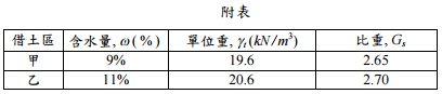 【已刪除】一、高速公路某路段的路堤填方工程需從甲借土區和乙借土區進行借土,借土區土壤基 本性質如附表所示。為考慮整體路段夯實土壤強度與變形的一致性,施工規範要求 甲、乙土壤先以 4:1 之體積比混合後再進行滾壓,且經滾壓後土壤之含水量ω= 12%, 乾土單位重γd = 20 kN /m