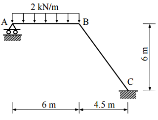 【已刪除】四、如圖所示剛架(frame),A 點為固接(fixed),C 點為鉸接(hinge)。若每根桿 件的彈性模數 E 與慣性矩 I 為常數,當 BC 桿件有一垂直均佈載重 1 kN/m 時,以矩 陣直接勁度法計算各桿件之彎矩,繪彎矩圖並標示最大與最小值。(25 分)