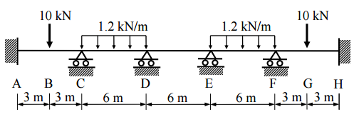 【已刪除】二、試以傾角變位法(slope-deflection method)計算圖示連續梁各結點處之彎矩與剪力, 並繪彎矩圖與剪力圖。圖中 A、H 兩點為固接(fixed),其餘支承均為滾支承( roller)。已知梁之彈性模數 E 與慣性矩 I 為常數。(25 分)