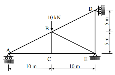 【已刪除】一、如圖所示桁架(truss),A、D 兩點為滾支承(roller),E 點為鉸接(hinge)。若 每根桿件的彈性模數 E 與斷面積 A 為常數,當 B 點有一垂直載重 10 kN 時,計算 支承之反力及各桿件內力。(25 分)