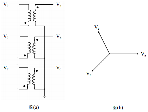 【已刪除】一、有一由三個單相加極性變壓器組合而成之△/Y 接三相變壓器,如下圖(a)所示,假設 電源相序如下圖(b)所示,若要求 Y 側(a、b、c 相)要落後△側(A、B、C 相) 30 度,請繪製相量圖並給予正確之連線。(20 分)