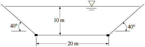 【已刪除】二、某一渠道底部的縱向坡降為 1/1000,其梯形截面及水位如下圖所示。假設水道的內 面工為混凝土鋪蓋,其曼寧係數(Manning’s coefficient, n)為 0.012,試分別推求該 渠道在此水位下之流量與福祿數(Froude number, Fr)。(20 分)