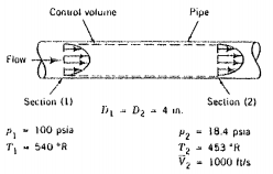 【已刪除】5. Air flow steadily belween Iwo sections in a long, straight portion of 4-inch inner diameter pipe as shown in the diagram. The uniformly distributed temperature and pressure at each section are given, [f the average air velocity (non-uniform distribution) at section (2) is l000ft/s, please calculate the average air velocity at section (1). (20%)