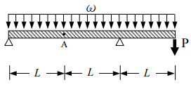 【已刪除】三、有懸臂的連續梁可以藉由增加懸臂端的載重,減少連續端的變形。試計算如圖中載重 P 的大小應為若干,才可減少連續梁中央 A 點因均佈載重ω造成的變形量之一半? 設梁的彎曲剛度為 EI。(30 分)