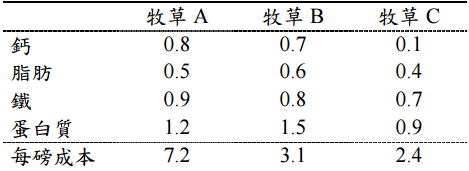 【已刪除】一、某農場以三種牧草的混合物餵食牛隻。該農場所飼養的牛隻必須符合其自行訂定的 營養需求:每隻牛每天需要 9 單位的鈣(超過或不足均不適當)、不超過 7 單位的 脂肪、至少 12 單位的鐵及至少 14 單位的蛋白質。下表顯示三種牧草每磅所含鈣、脂 肪、鐵及蛋白質的量。牧草 A 每磅的成本是 7.2 元、牧草 B 是 3.1 元、牧草 C 是 2.4 元。該農場應如何餵食牛隻,才能在符合營養需求的情況下,使得牧草的總成 本最低?建立此問題的線性規劃模式(不必求解)。(25 分)