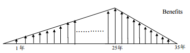 【已刪除】一、一水資源開發計畫其效益隨時間的變化如下圖所示,在第 1 年末至 25 年末效益以 等量的方式增加至 50,000 元,第 25 年末之後以等量的方式減少,故第 35 年末的效 益為 0 元。試問在年利率 6%的條件下此計畫的效益現值為多少?(20 分)