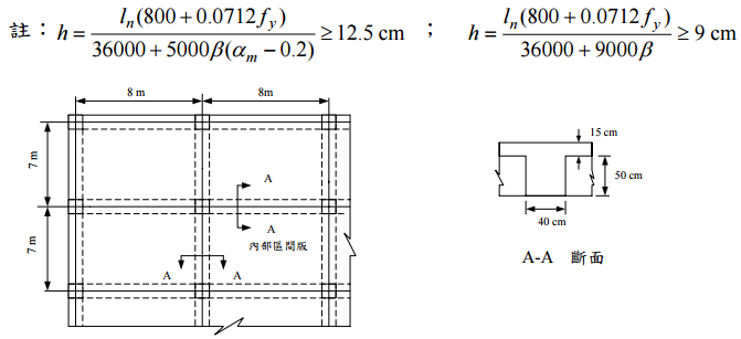 ,梁斷面尺寸皆相同, 請以撓度控制要求檢核內部區間版厚h =15 cm是否恰當。(25 分)