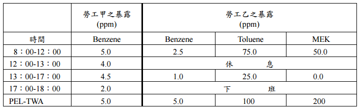 【已刪除】一、試評估甲、乙二勞工之暴露狀況。某日之暴露紀錄如下:(20 分)