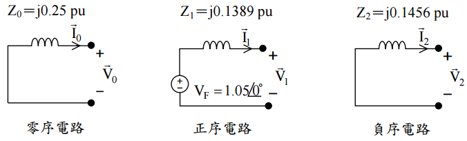 【已刪除】四、假設某一電力系統發生單相接地故障,其接地故障阻抗為零,並已知自該故障點看進 去之各相序戴維寧(Thevenin)等效電路分別如下圖所示;假設故障前之負載電流可 忽略不計,試求接地點之故障電流安培數,已知下圖標么值採用基值為 100 MVA, 13.8 kV。(20 分)