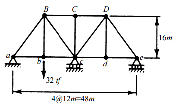 cm / cm /℃,一個 32 tf的載重作用於b點,假設c支承預估最後會向下位移 5 cm(包括溫度、載重及下沉共 5 cm),所有桿件L / A =1 m / cm
