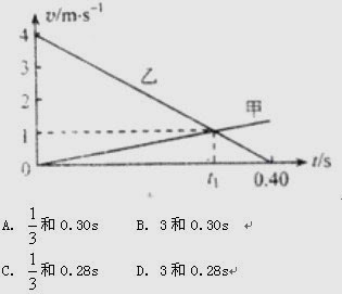 15. 两物体甲和乙在同一直线上运动,它们在0~0.4s时间内的v-t图象如图所示。若仅在两物体之间存在相互作用,则物体甲与乙的质量之比和图中时间t1分别为 (A)和0.30s (B)3和0.30s (C)和0.28s (D)3和0.28s