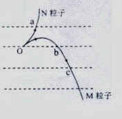 19. 图中虚线为匀强电场中与场强方向垂直的等间距平行直线。两粒子 M、N质量相等,所带电荷的绝对值也相等。现将M、N从虚线上的O 点以相同速率射出,两粒子在电场中运动的轨迹分别如图中两条实线所 示。点a、b、c为实线与虚线的交点,已知O点电势高于c 点。若不计 重力,则 (A) M带负电荷,N带正电荷 (B) N在a点的速度与M在c点的速度大小相同 (C) N在从O点运动至a点的过程中克服电场力 做功 (D) M在从O点运动至b点的过程中,电场力对 它做的功等于零