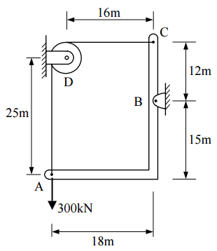 【已刪除】三、圖中 ABC 為剛性構件(rigid member),B 點為鉸支(hinge),D 點為無摩擦之滾 輪(pulley),繩索 ADC 為不可拉伸。已知滾輪半徑為 2 m,試計算繩索 ADC 之 張力與 B 點之反力(reaction)。(25 分)